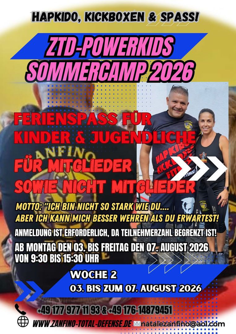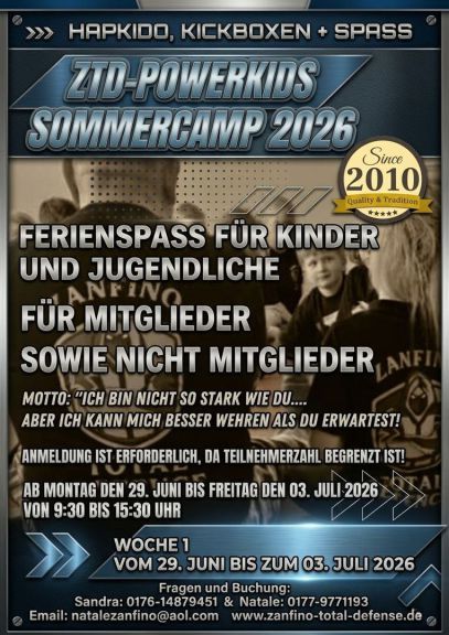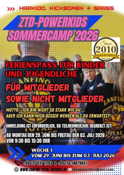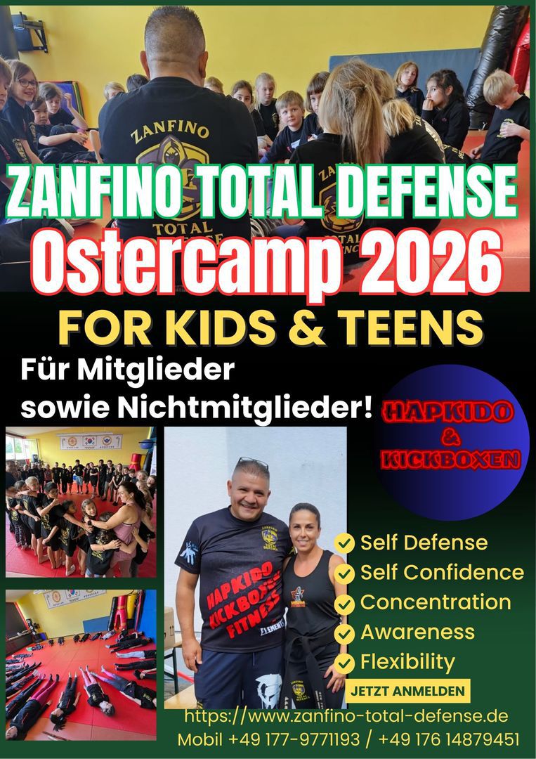 Beim ZTD-Feriencamp von ZANFINO TOTAL DEFENSE erlernen Kinder und Jugendliche im Alter zwischen 7 und 14 Jahren mit Freude sich für das Thema Selbstverteidigung zu sensibilisieren. Dabei steht Prävention im Vordergrund. Das Feriencamp eignet sich für Anfänger/innen sowie für Jugendliche mit Vorkenntnissen. Altersgerecht werden die Teilnehmenden an das Erkennen von Gefahren, Deeskalationstechniken und Selbstverteidigungs-maßnahmen geschult.